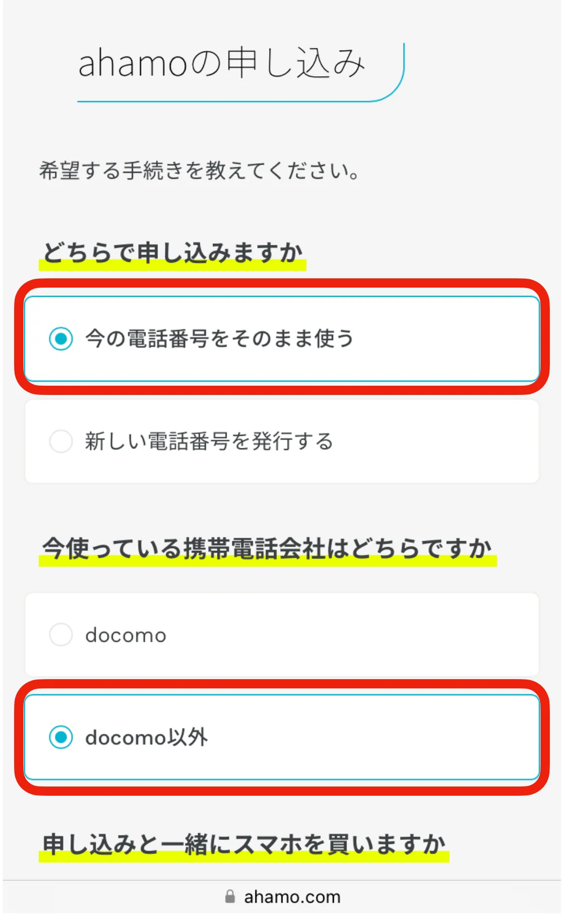 - スマホを買いますか:「買わない(持っているスマホを使う)」