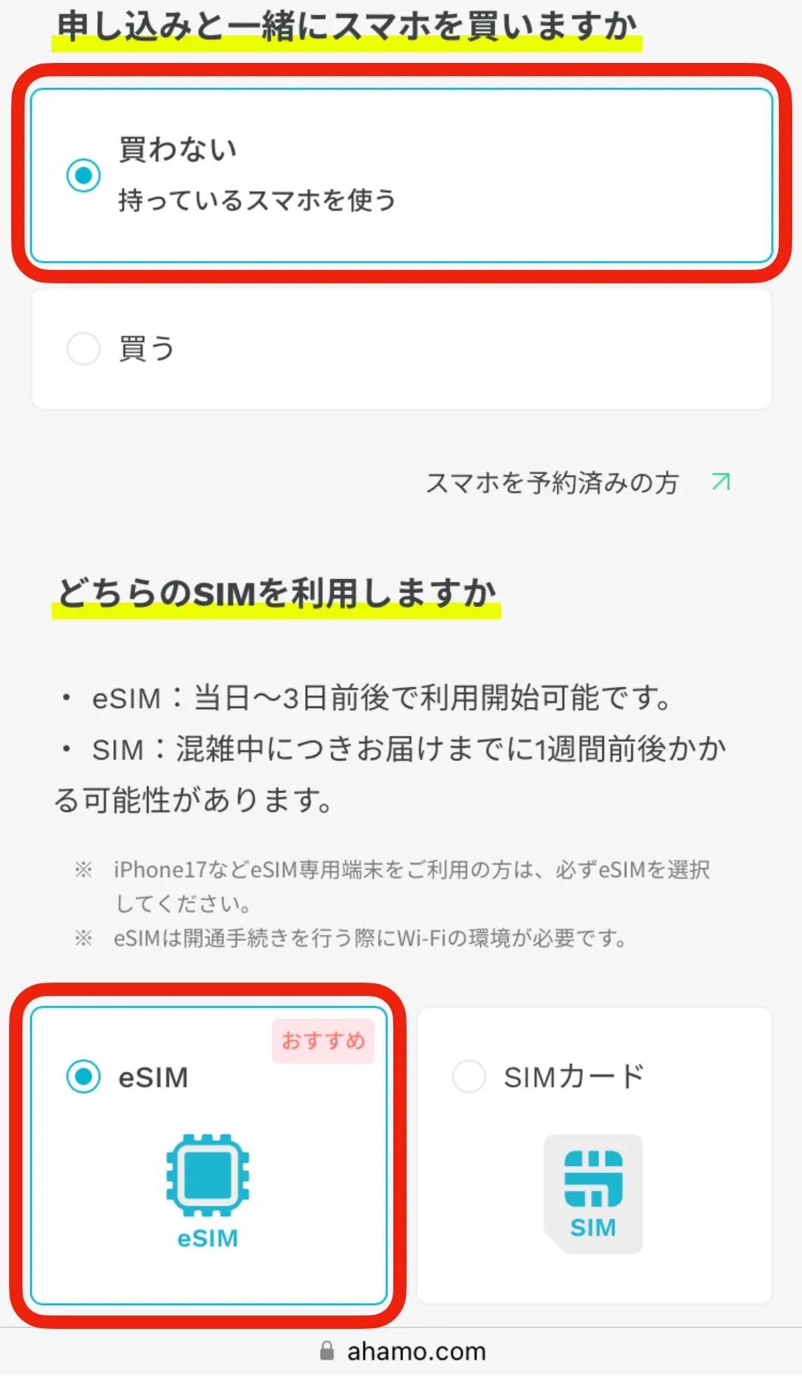 ステップ②:契約方法と「eSIM」を選択する