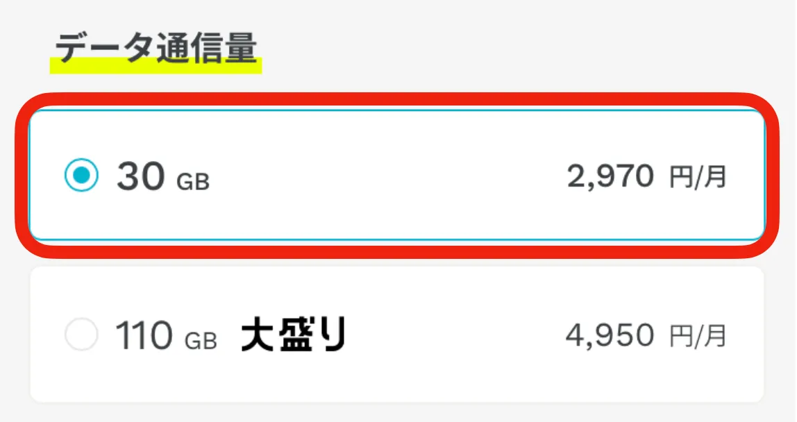 - データ通信量:「30GB(2,970円)」を選択(※海外利用ならこれで十分です!)