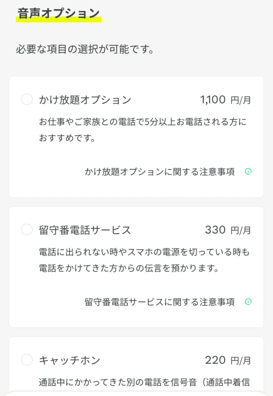 - 音声オプション: かけ放題が必要なければチェックなしでOK